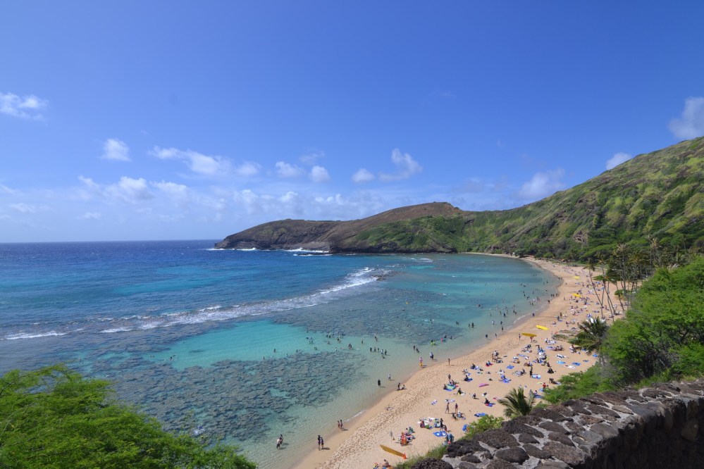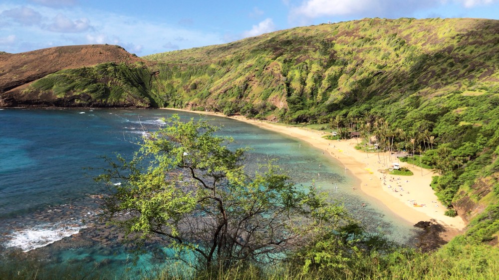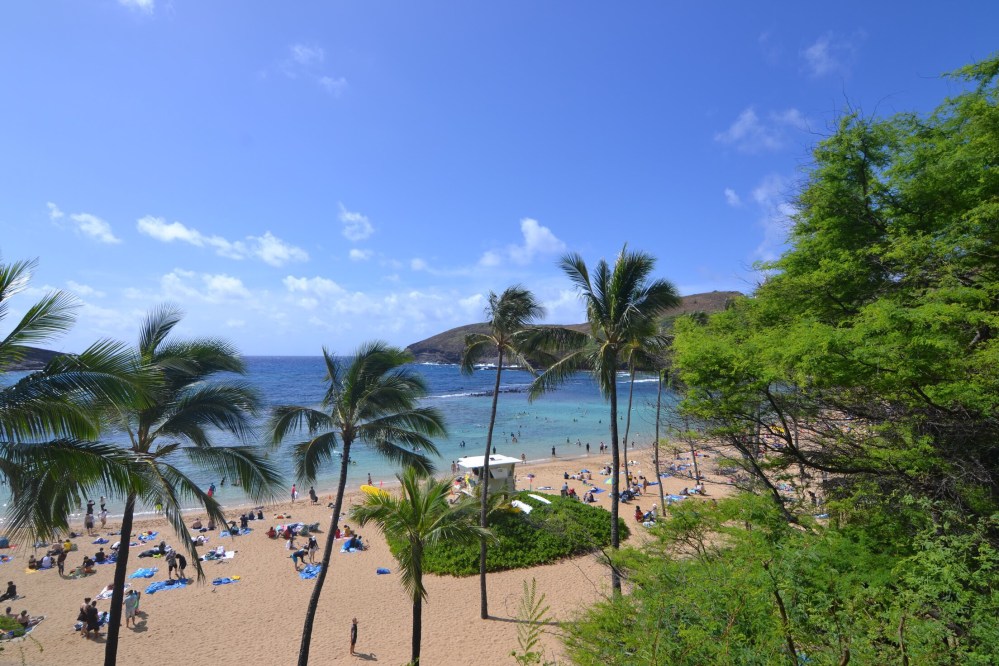 There are a lot of beautiful places right on the south side of the island near Waikiki Beach. One of the first stops was the oft-talked about Hanauma Bay. We’re glad we went – great snorkeling, and very beautiful – but it was certainly very commercialized. We arrived relatively early, around 8 AM, and there were already lines. You have to pay $7.50 each to enter (we have our own snorkeling gear, but you can rent from the beach), and then you’re horded into a theater where you have to watch a safety and conservation video. I’m glad we had to watch it, because there were a lot of tourists who clearly had never snorkeled before, so perhaps it cut down on the number of people who were stepping on the coral! The bay is closed Tuesdays to help the reef recover, and the reef is extremely shallow minus two rip currents that flow through. The beach is just fine, and the snorkeling does get crowded, although the bay is large enough to not run into other people all the time.