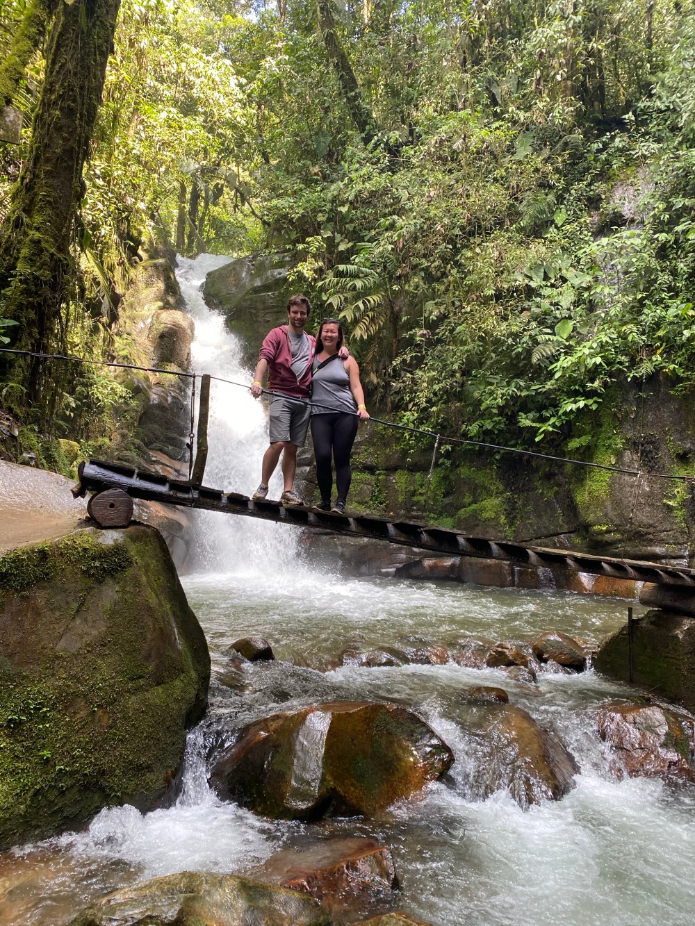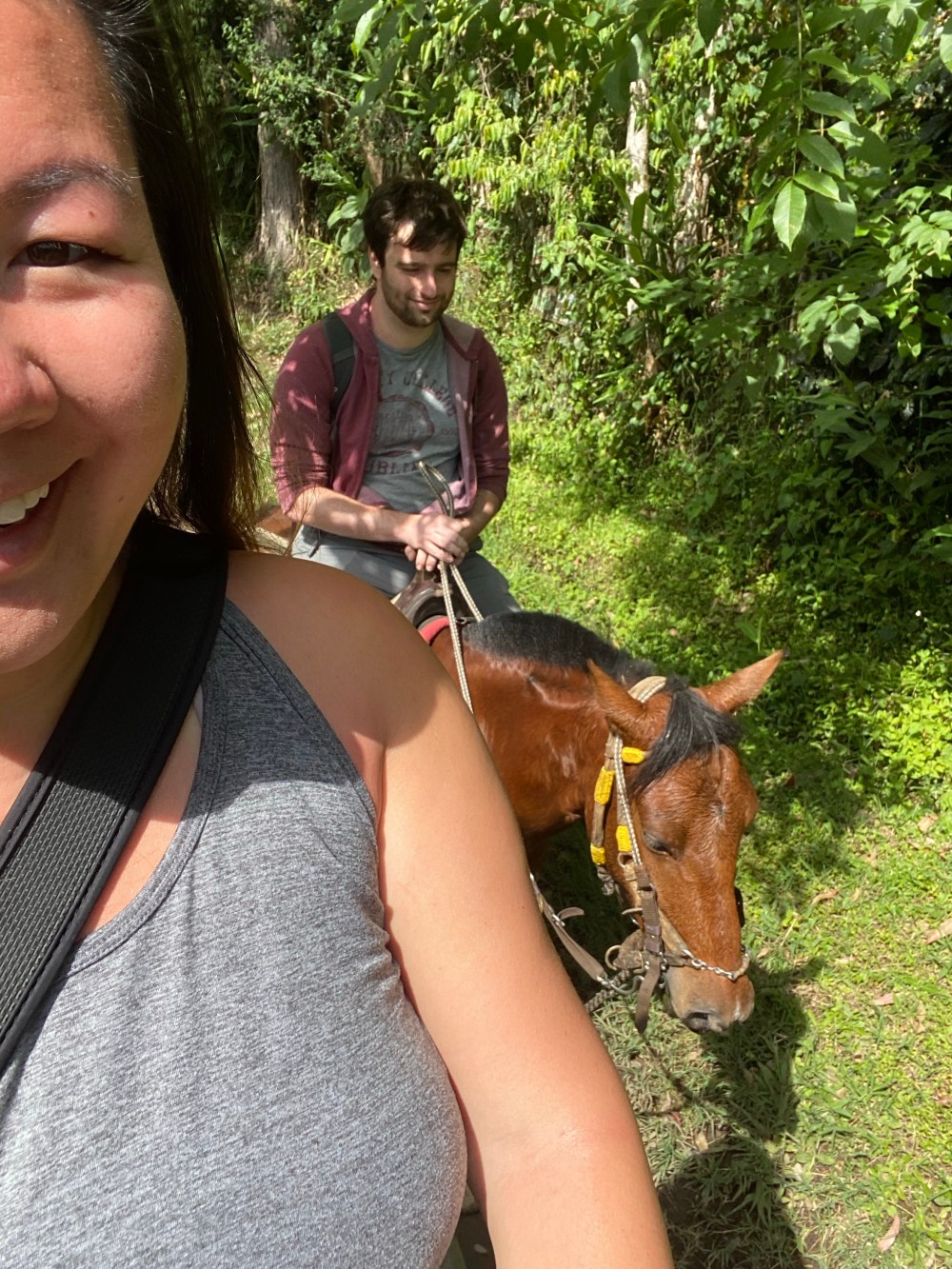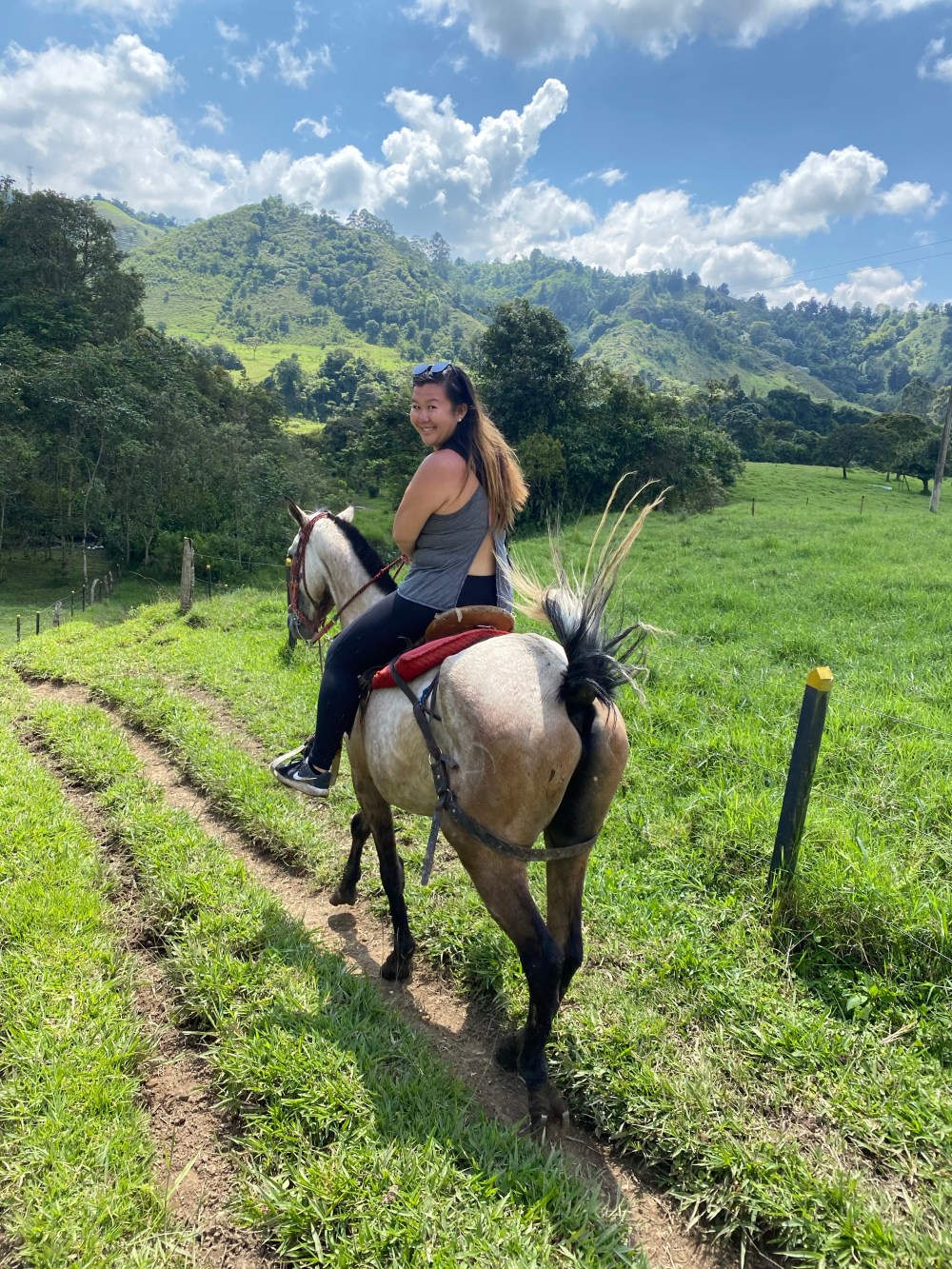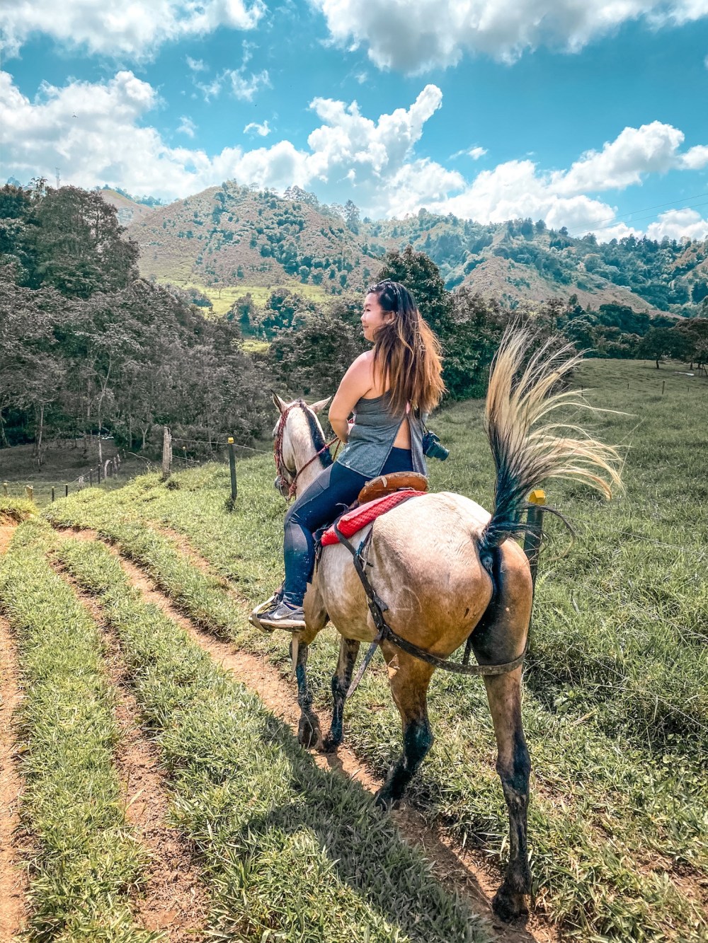The next day we wanted to do a horseback ride to a coffee plantation, and found a company ahead of time with great reviews on TripAdvisor. They told us to meet at the main square, which we did…then accidentally followed the wrong horseback riding company. Because of the language barrier, we ended up trekking a few hours to a waterfall and just passing by the coffee plantations on the way. It was still beautiful, but there was a stretch of trail (not pictured) that was a tiny path straight down a mountain with really loose rubble. I consider it proper horseback riding, even though the fastest we went was a canter – M was a champ! We spent some lovely time at Cascada Santa Rita, and spent the rest of the day trekking back to Salento.
