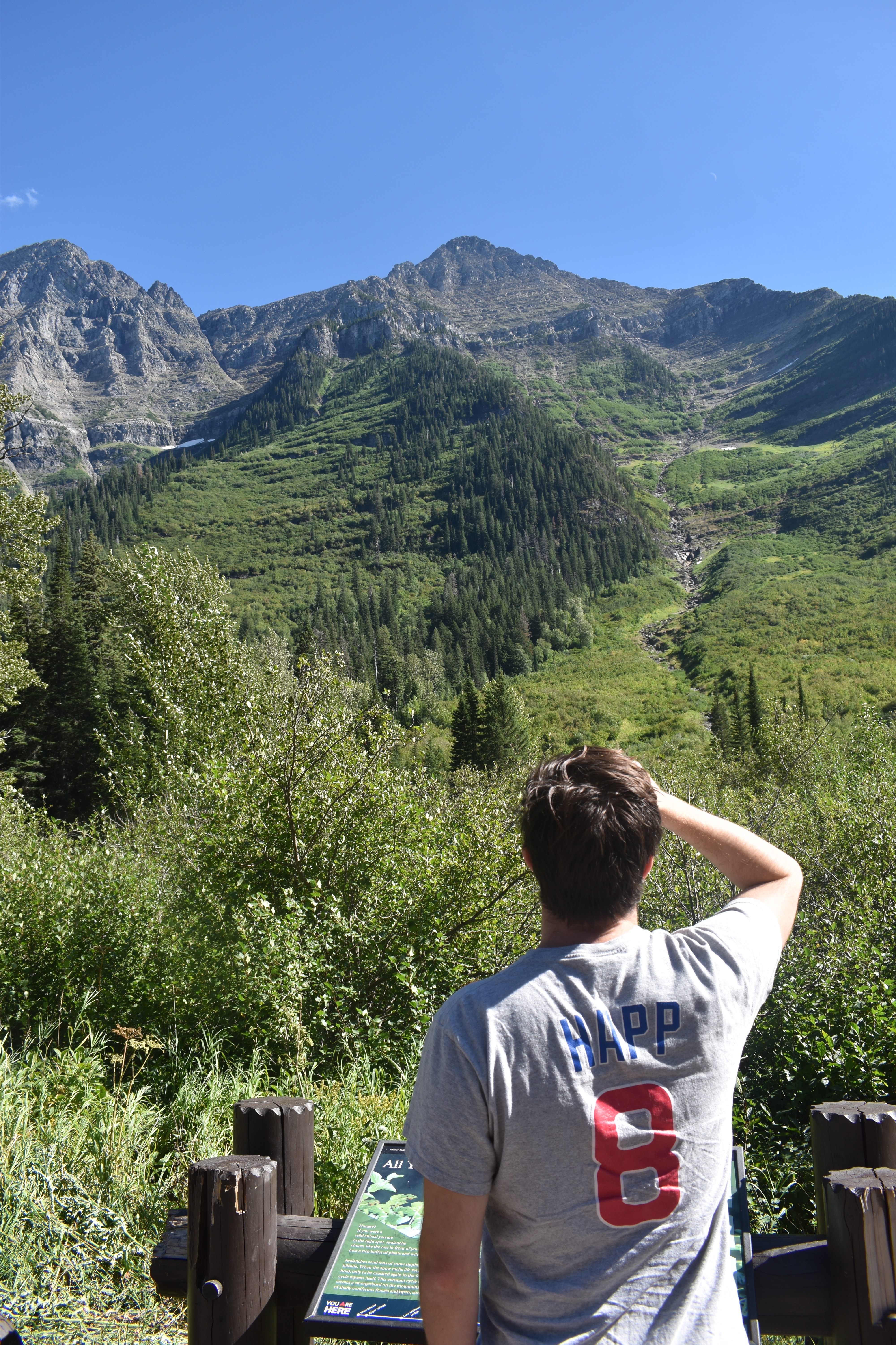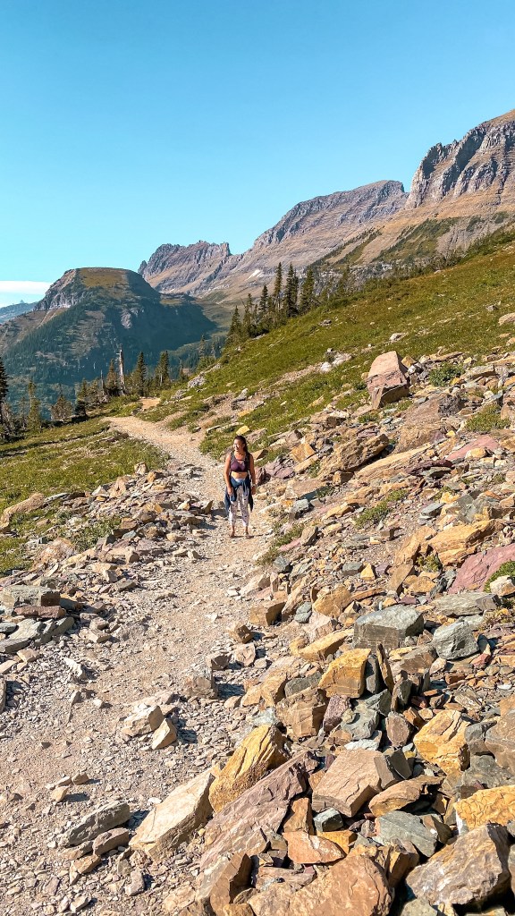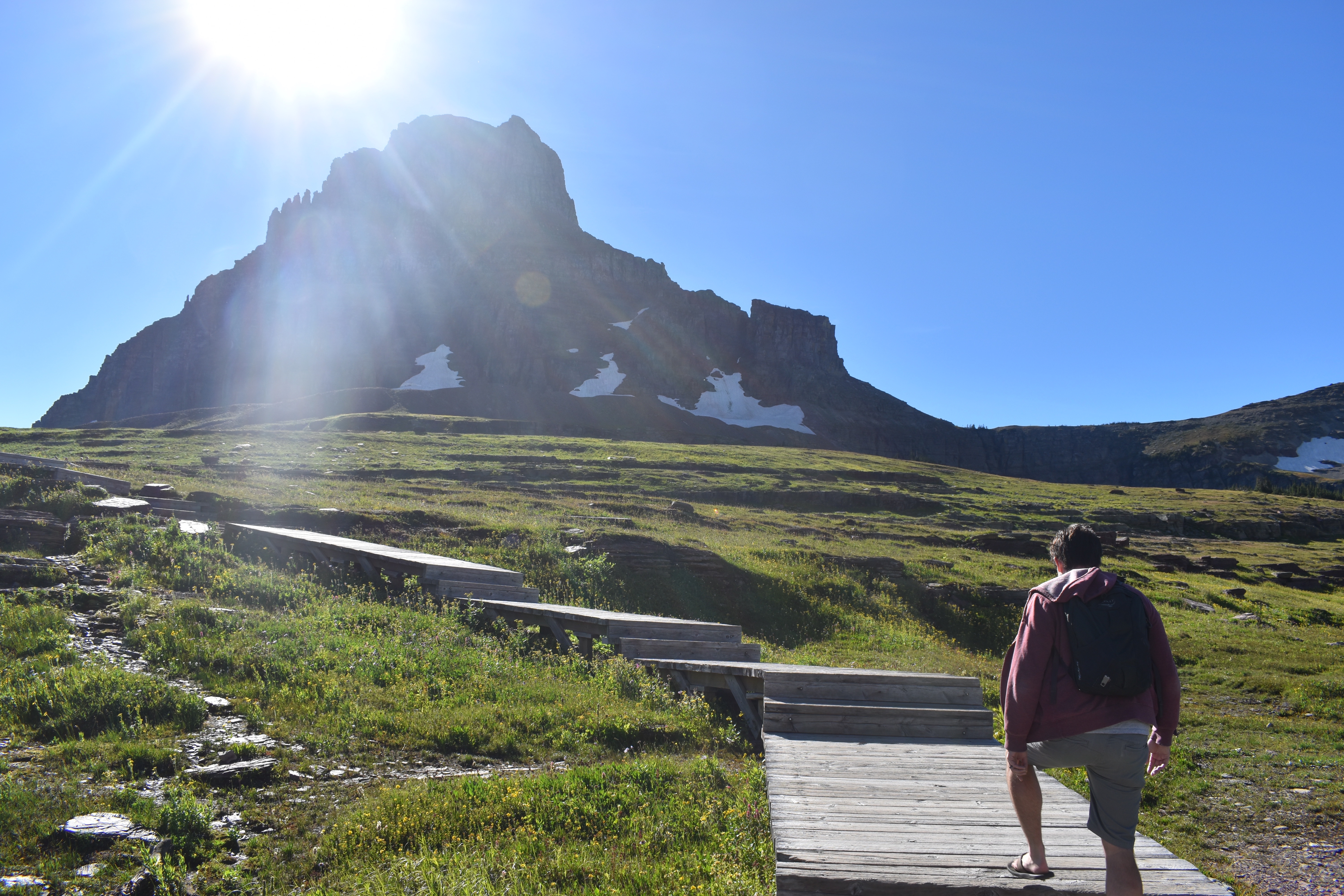 Parking at Logan’s Pass to get to this trail. This is a pretty easy/moderate trail since it’s paved, although it does have some elevation gain (plus Logan’s Pass is at 6’700 ft elevation anyway, so you might need some time to get acclimated if you’re not used to hiking). Logan’s Pass is the largest parking lot in the park, but it’s still small – get here super early or late (after 4:30 PM) to snag a spot. We easily parked here at 4:30 PM/5PM on both days. For hidden lake, I recommend not going down to the lake – the overlook is the best part! Visiting Glacier during August is ideal, since that’s when all the wildflowers are in bloom.