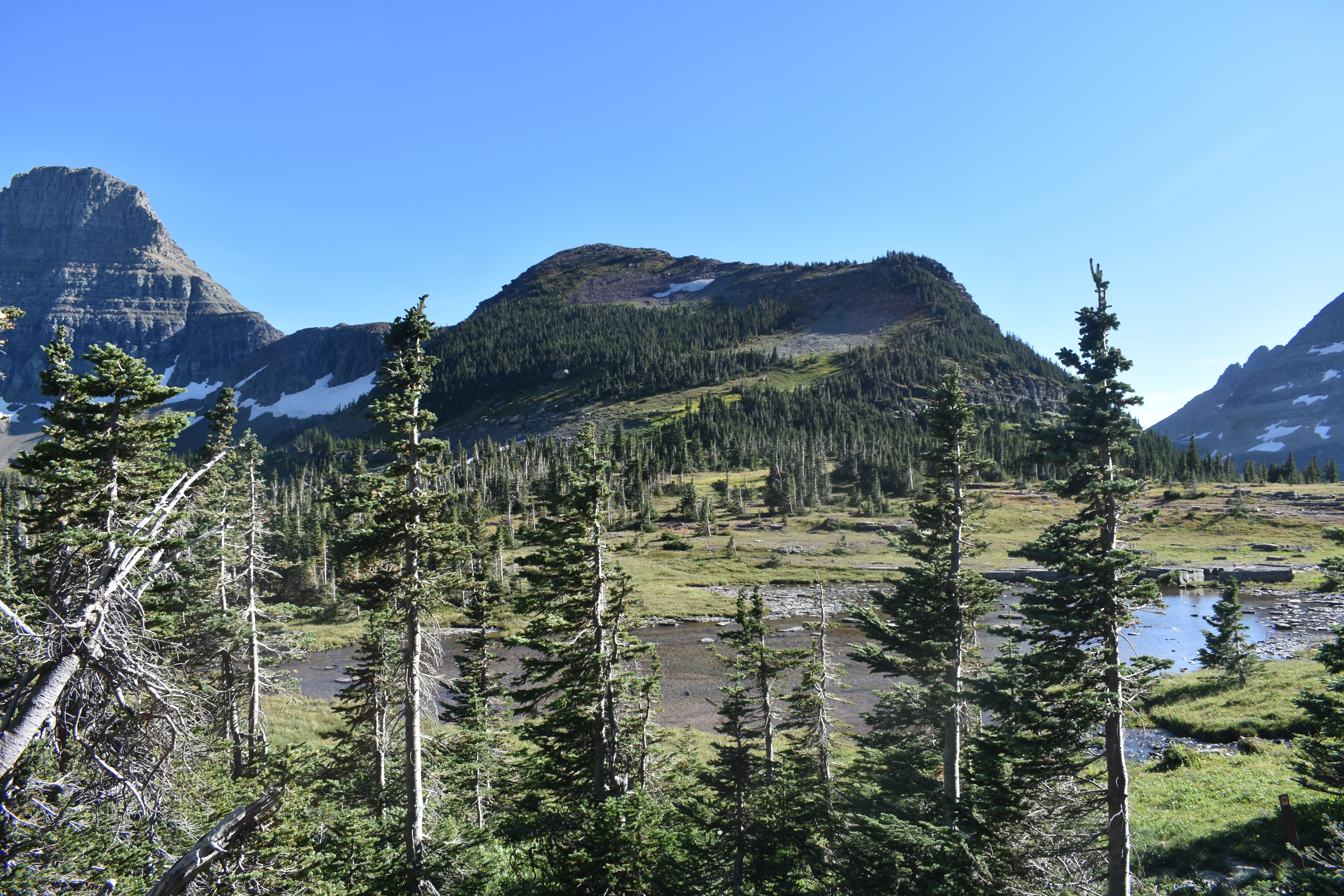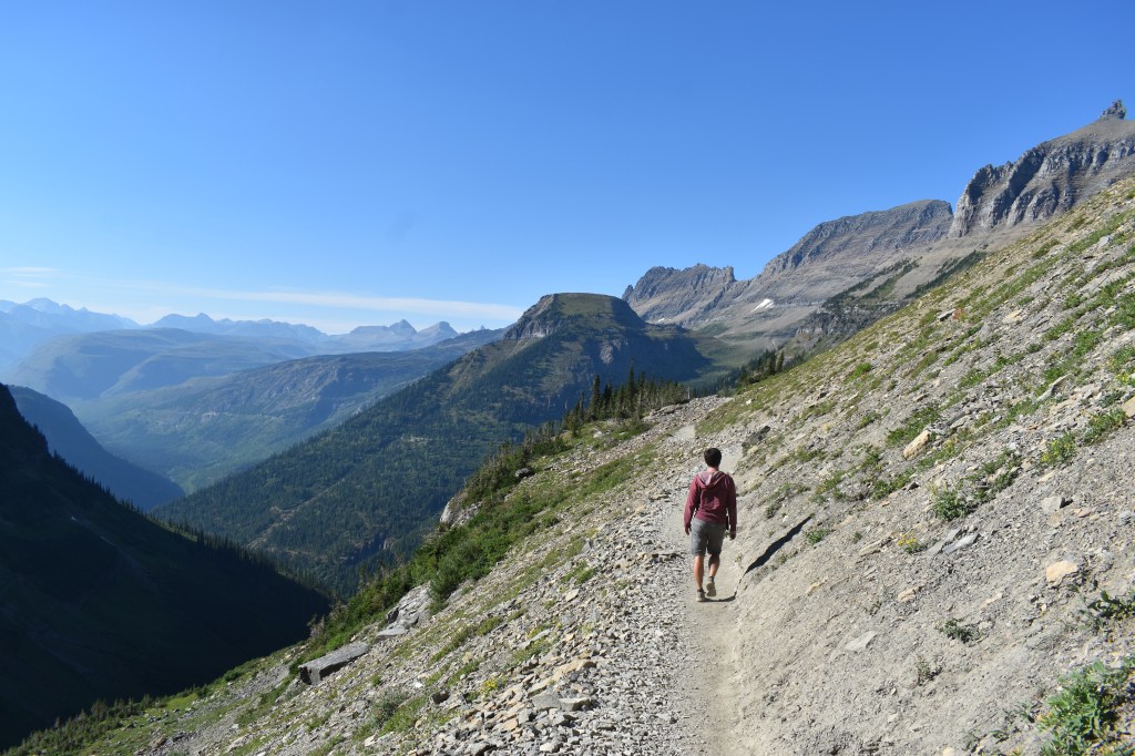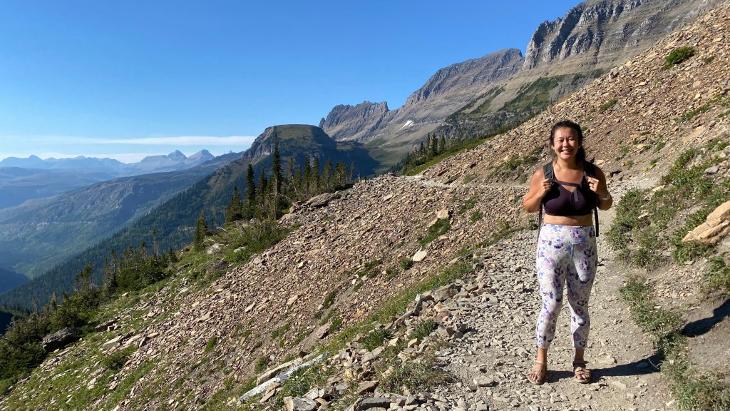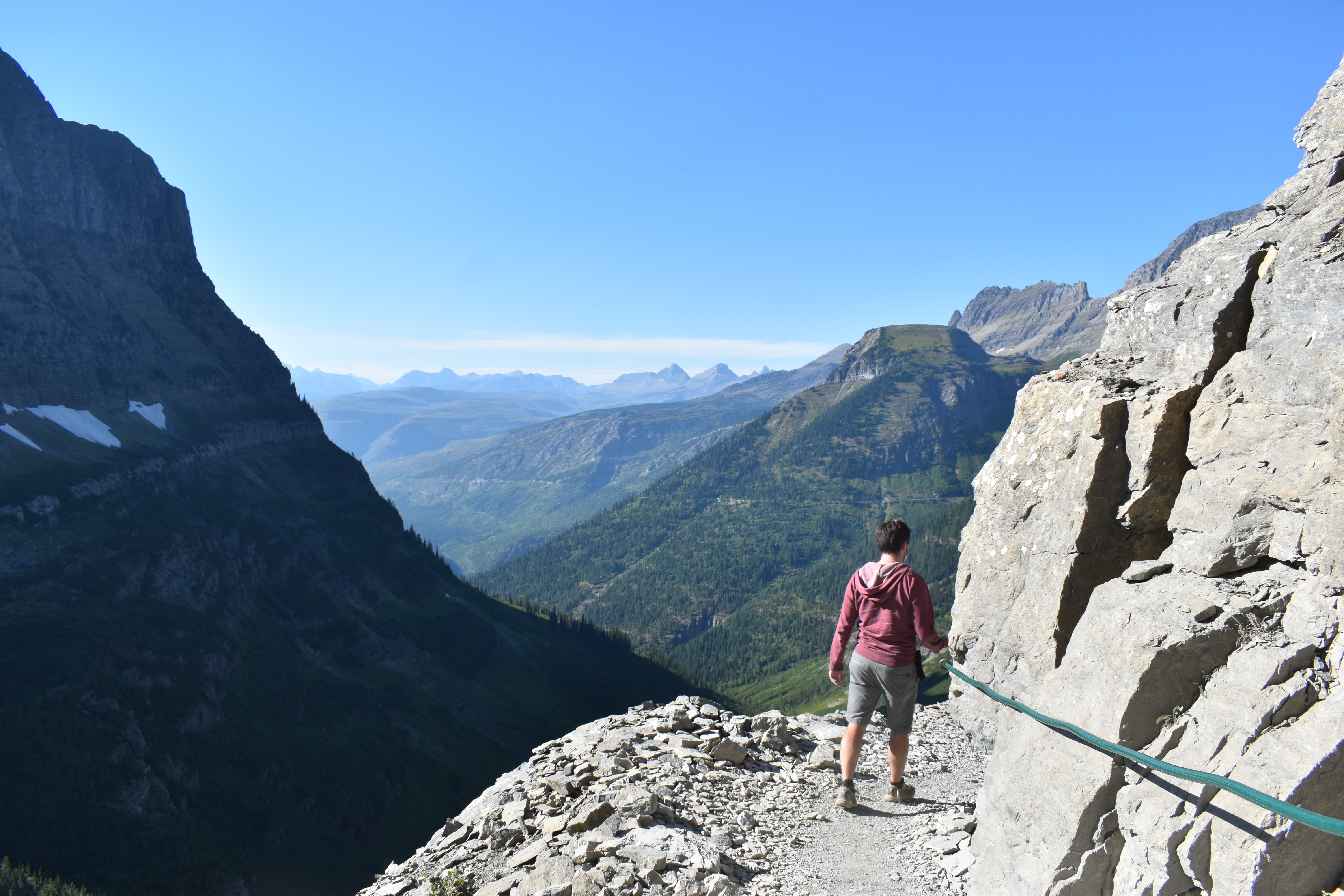 Parking at Logan’s Pass to get to this trail. This is a pretty easy/moderate trail since it’s paved, although it does have some elevation gain (plus Logan’s Pass is at 6’700 ft elevation anyway, so you might need some time to get acclimated if you’re not used to hiking). Logan’s Pass is the largest parking lot in the park, but it’s still small – get here super early or late (after 4:30 PM) to snag a spot. We easily parked here at 4:30 PM/5PM on both days. For hidden lake, I recommend not going down to the lake – the overlook is the best part! Visiting Glacier during August is ideal, since that’s when all the wildflowers are in bloom.