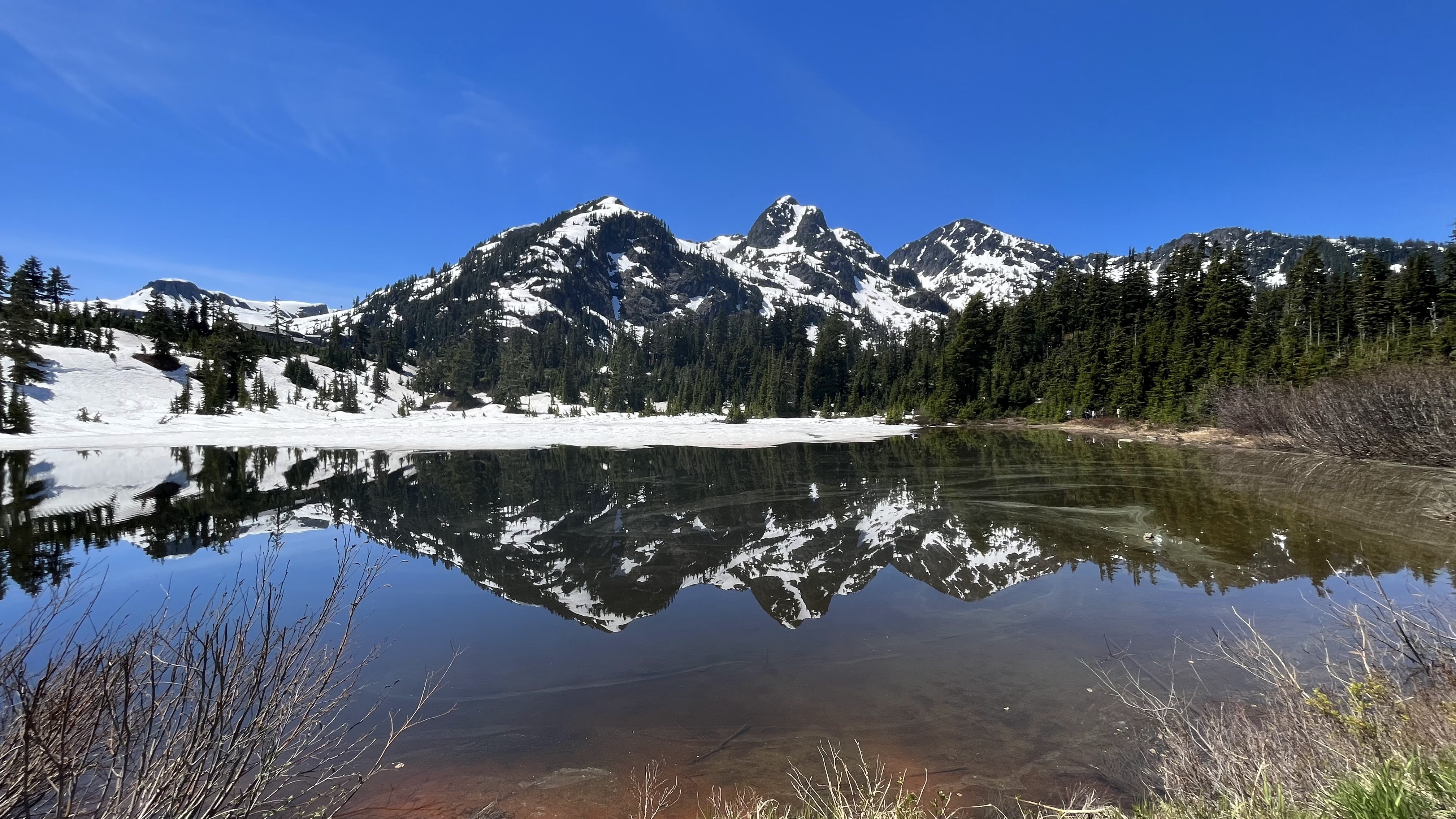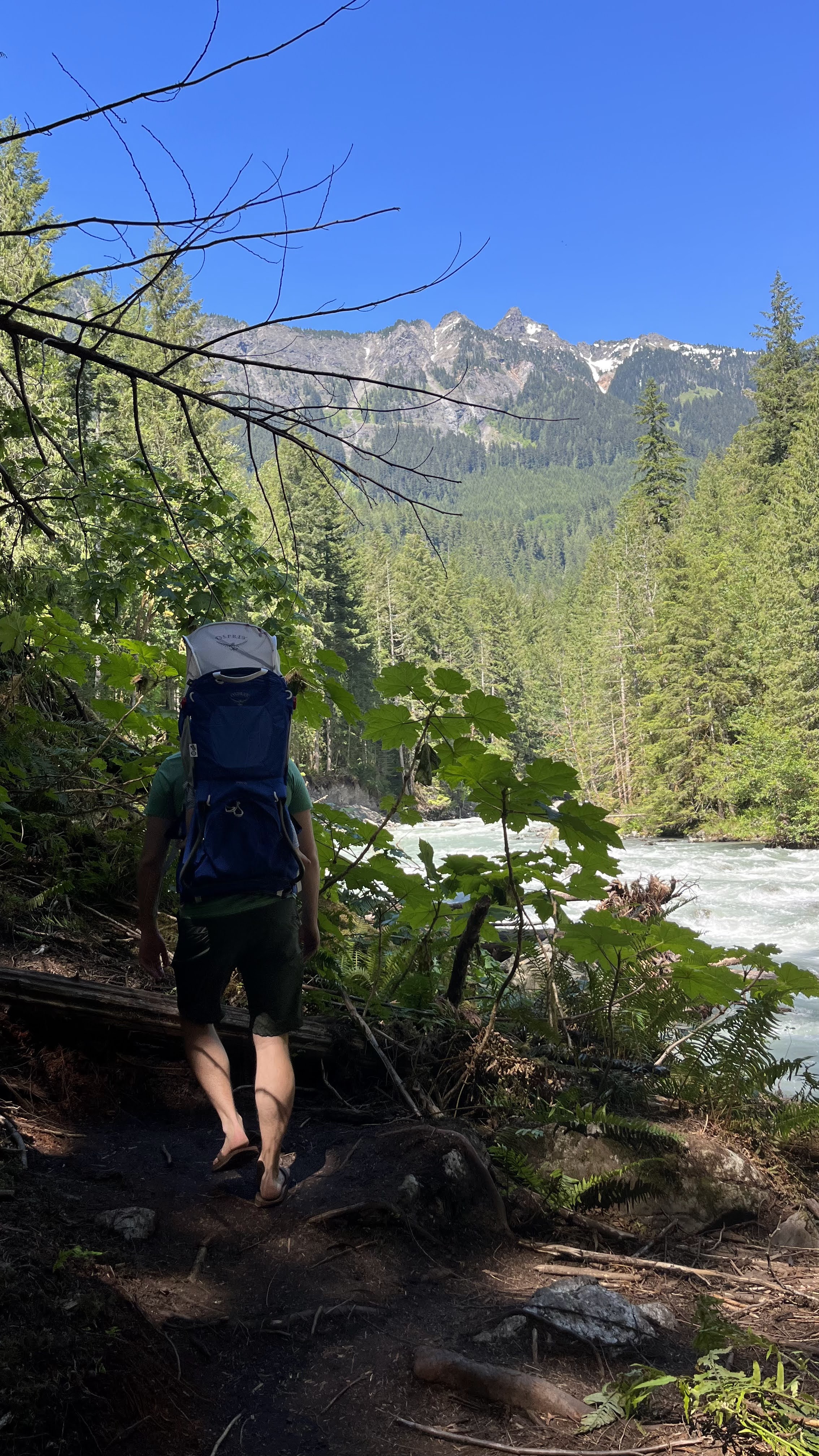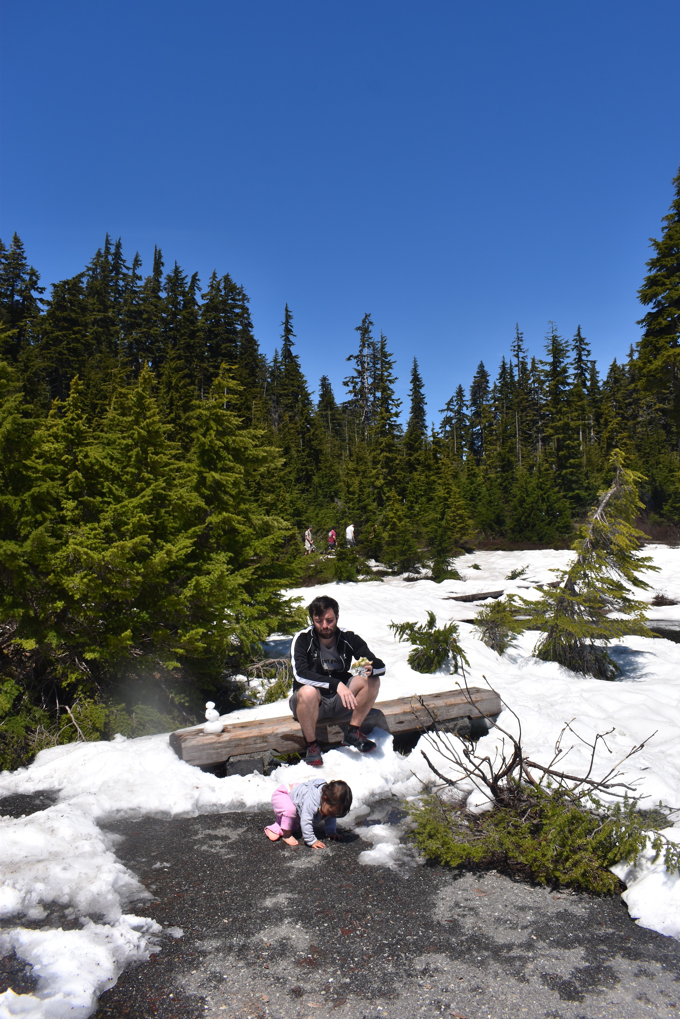 I was dumb and didn’t realize that the North Cascades would still be completely snowed in by end of June. Apparently August is a much better time to visit. Oops! So we mostly did local walks and chilled with our friends in our cute treehouse cabin. North Cascades is apparently the most remote / least-visited national park in the US, and it definitely showed via the sparse lodging options. We stayed in Mt. Baker, which would’ve been a 1.5-2 hour drive to the heart of the North Cascades (Diablo Lake etc). We didn’t want to do that as a day trip with S, so we stayed around the Artist Ridge and Nooksak River area instead. Artist Ridge was actually also still snowed in, so we only got as far as Picture Lake…it was cool seeing 15 ft of snow in the middle of summer, anyway!