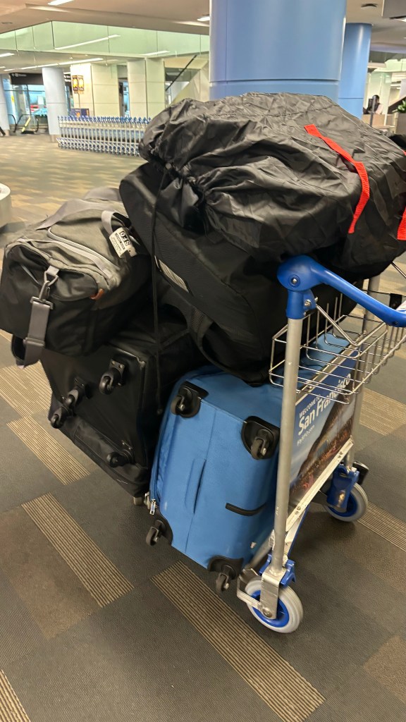 - Both carseats (I don’t usually trust car rental agencies car seats). We have these padded carseat bags to protect the seats when they get checked. We never bring them onto the plane because we find that our kids / babies get the wiggles and don’t like sitting in their seat when they’re babies, and when they’re old enough (like S) they can just sit in their own normal seat. We also add in diapers and additional items that fit into the carseat bags when we check them in, to give us extra space in our bags. Car seats and strollers are checked in for free. This time we checked in 2 car seats, a hiking carrier, and a travel bed for free.