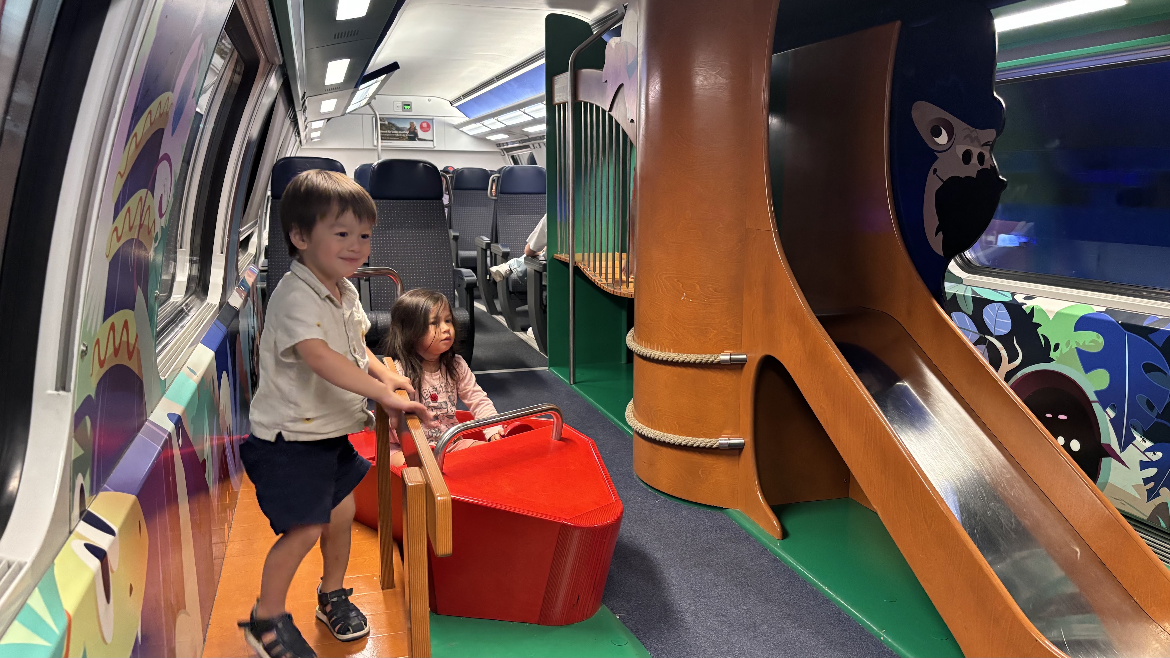 We also decided to take the train in between places as well, since everything was connected via public transport and various cable cars, funiculars, etc. Many of the villages were car-free anyway, and it was basically impossible to find a car big enough for 3 car seats regardless. I was only nervous about bringing all our stuff onto various trains, especially after a red-eye, but we just packed everything into two hiking backpacks, a double stroller, two kid backpacks, and a doona. Since our first Airbnb had a washer and dryer, I actually think we could’ve gotten away with fewer clothes since we were doing a load of laundry every night anyway. We also probably could’ve gotten away with not bringing a doona, since our double stroller is newborn friendly and it was easier to carry baby onto busses and on hikes. But ultimately it was nice having a place to set all 3 of them down and be able to save our backs. Being able to sit on a train and have space to wiggle out the sillies for our long travel days were helpful in maintaining a relaxed vacation atmosphere – as someone who doesn’t do well on roadtrips especially with screaming kids, this ended up being a great call, especially since many of the trains have playgrounds built in.