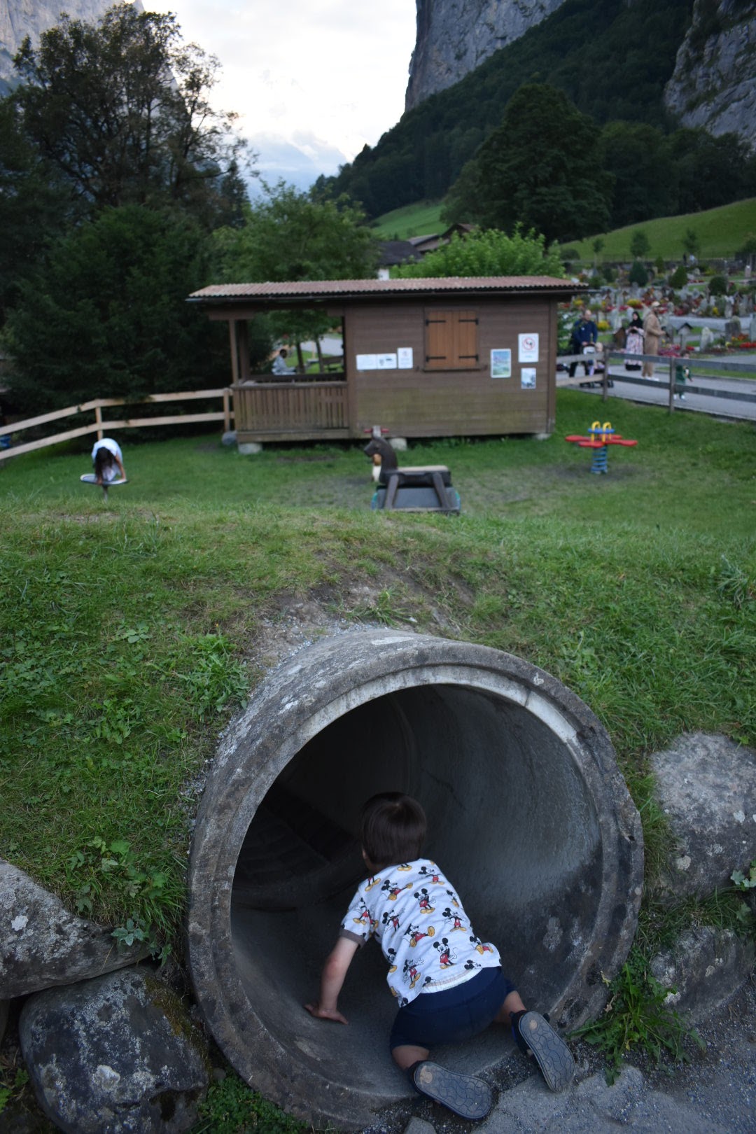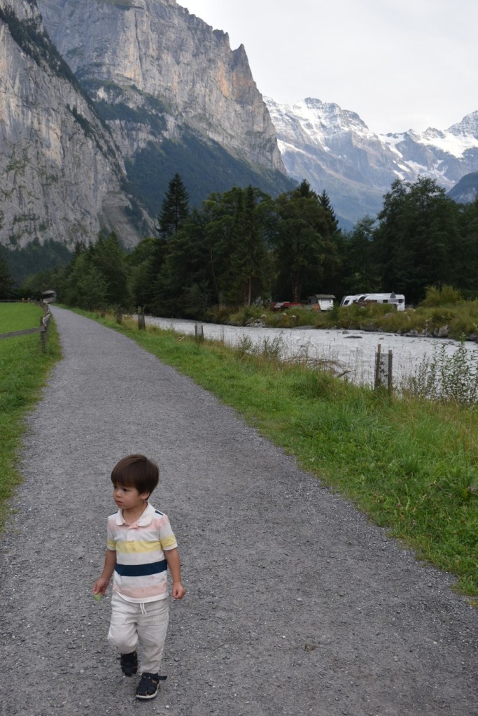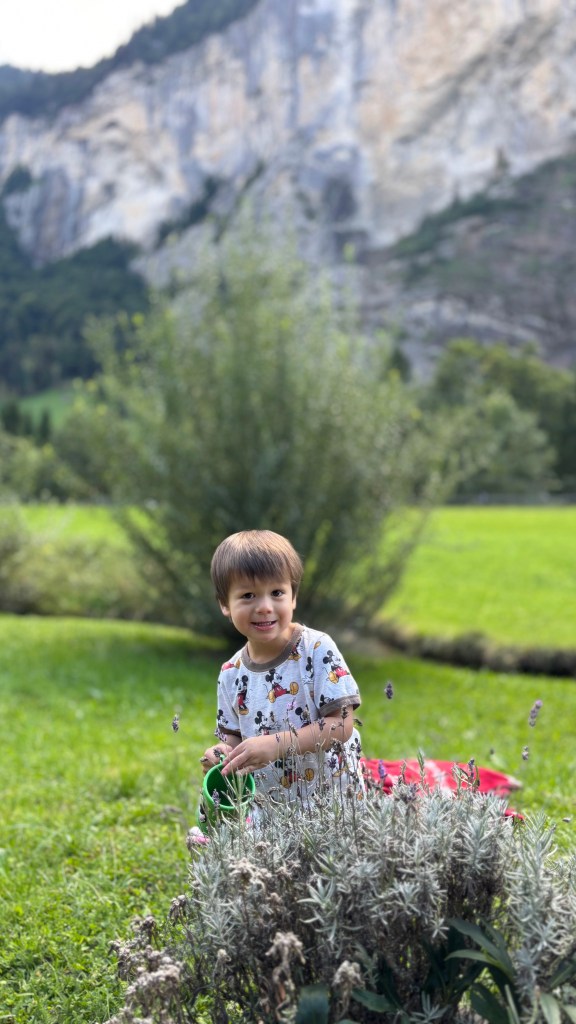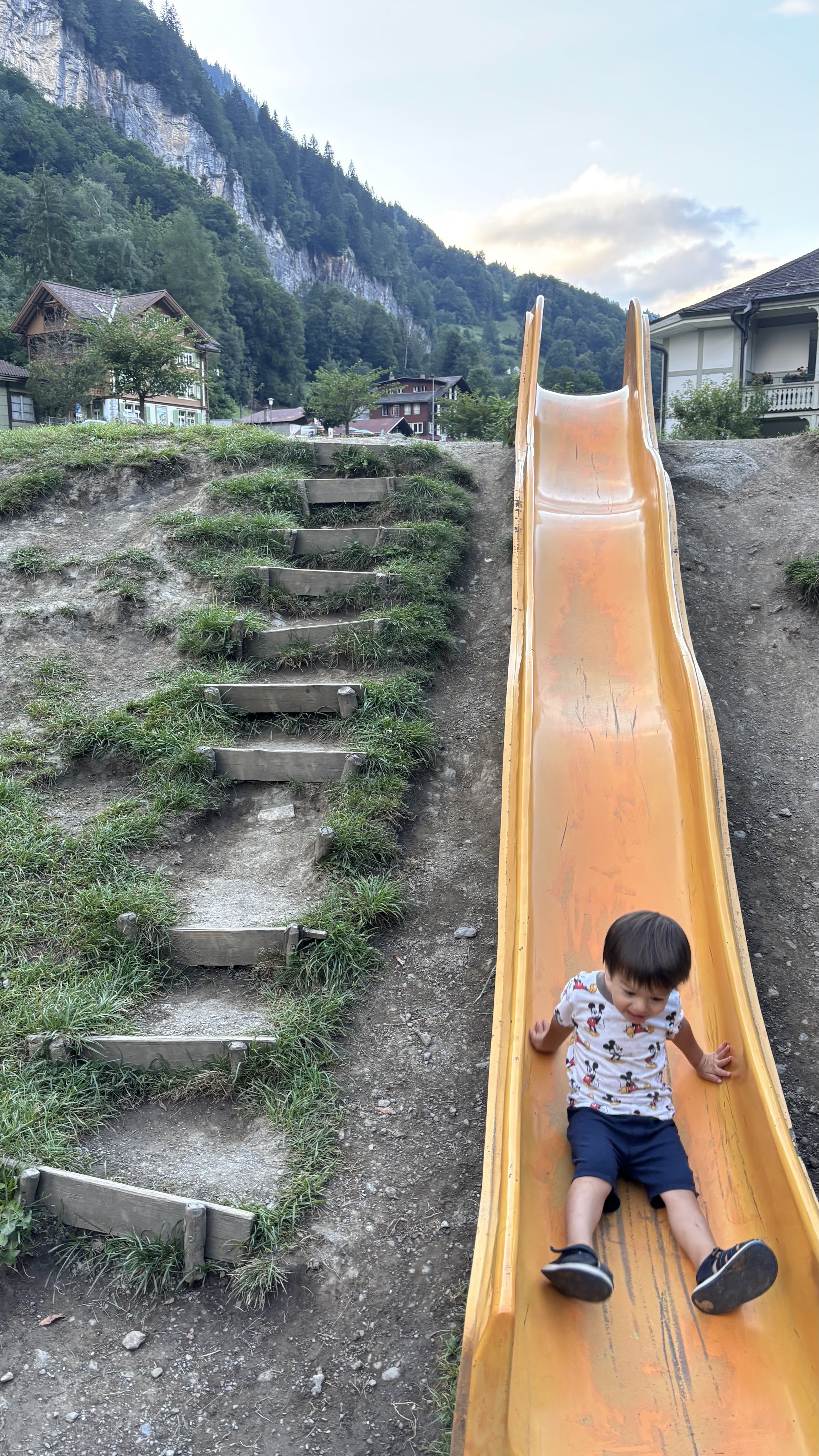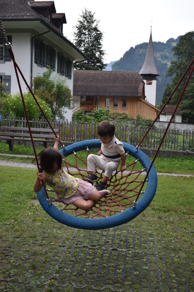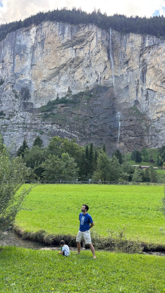 There is a small Coop for groceries at the train station, although it’s smaller than the Coop in Wengen and Murren. It had everything we needed for breakfasts and easy lunch sandwiches. Our Airbnb was an easy 15 min walk from town center; there was also a bus that dropped us off in front of the apartment complex. We loved having our own outdoor space and stream to play in and dine on, and we were only a 4 min walk from an al fresco dining restaurant with a large outdoor play space. We were only a 10 min walk to the main Lauterbrunnen playground, via walking along the main river. We split the difference for jet lag and put the kids to bed around 10, and woke around 9:30 – this worked well for us since it got dark around 9 so we were able to spend post-nap time around Lauterbrunnen playing on the playgrounds, while our mornings included an outing to a neighboring village or a hike. Baby has been sleeping through the night for a while now, but had a pretty easy transition to the time change probably because she’s still a potato and naps all the time anyway.