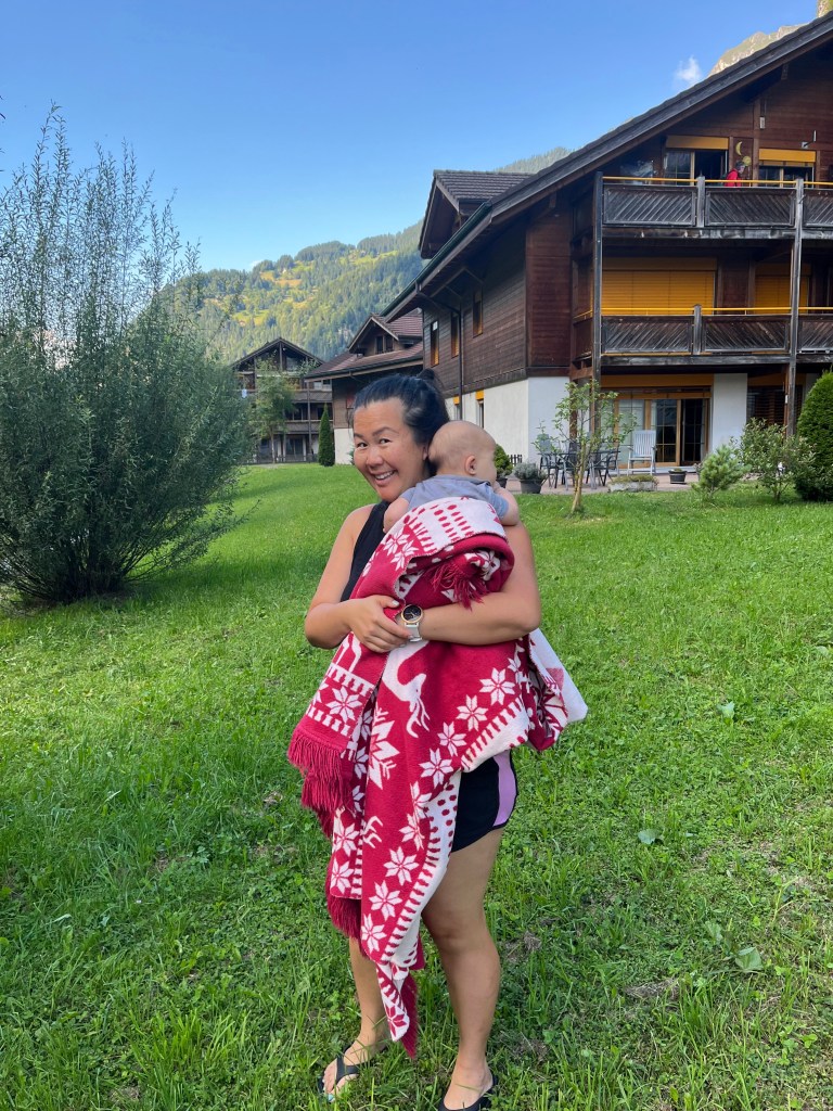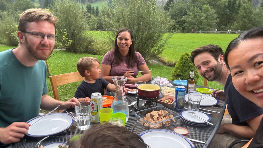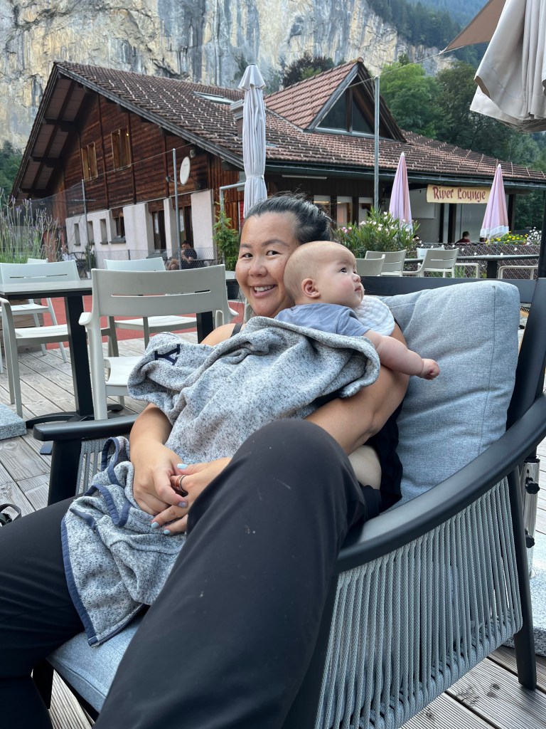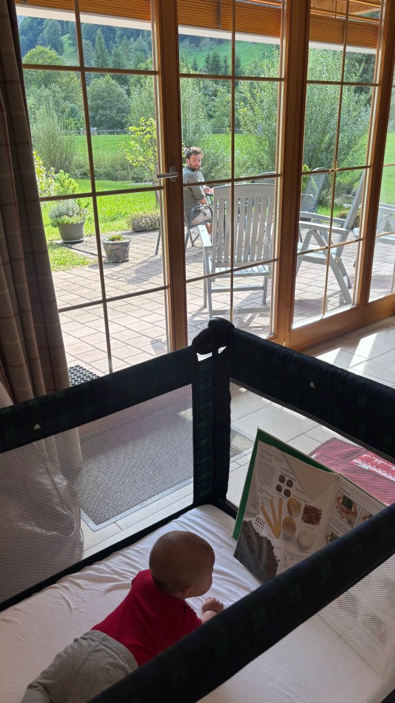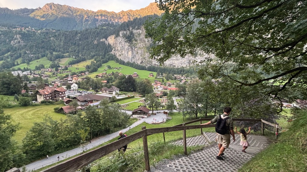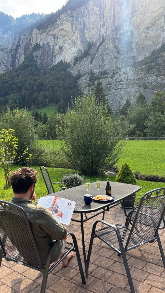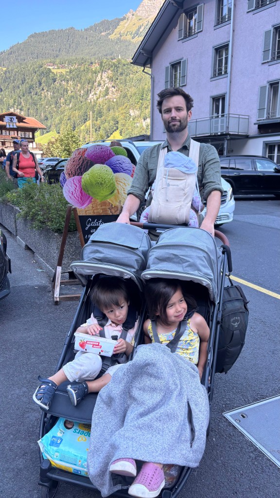 There is a small Coop for groceries at the train station, although it’s smaller than the Coop in Wengen and Murren. It had everything we needed for breakfasts and easy lunch sandwiches. Our Airbnb was an easy 15 min walk from town center; there was also a bus that dropped us off in front of the apartment complex. We loved having our own outdoor space and stream to play in and dine on, and we were only a 4 min walk from an al fresco dining restaurant with a large outdoor play space. We were only a 10 min walk to the main Lauterbrunnen playground, via walking along the main river. We split the difference for jet lag and put the kids to bed around 10, and woke around 9:30 – this worked well for us since it got dark around 9 so we were able to spend post-nap time around Lauterbrunnen playing on the playgrounds, while our mornings included an outing to a neighboring village or a hike. Baby has been sleeping through the night for a while now, but had a pretty easy transition to the time change probably because she’s still a potato and naps all the time anyway.